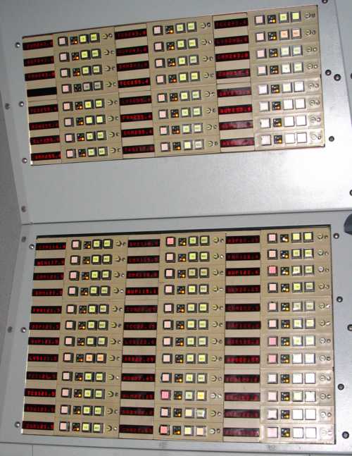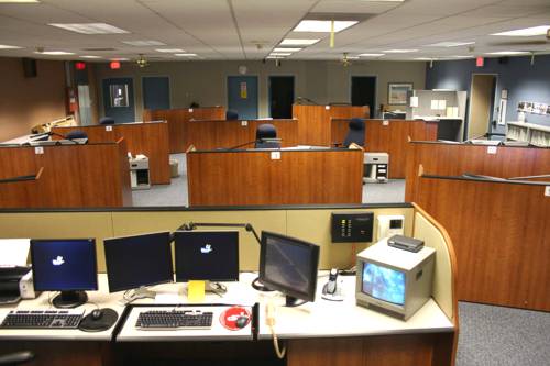 OASIS Supervisory console. From left to right are the OASIS monitors, ACD Call monitor (center), and security monitors far right.